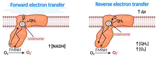 Energetically degenerate catalytic steps [] render reaction 4 fully reversible, provided a sufficient thermodynamic driving force exists, which occurs when the free energy released from electron transfer is insufficient to pump protons against the prevailing Δp [] (Figure 2). Reverse electron transfer (RET) catalyzed superoxide production was discovered by Chance and co-workers in 1967 [], and was considered irrelevant, until Murphy’s group showed that RET contributed to cardiac ischemia reperfusion injury (IRI) in 2013–2014 [,]. We now know that RET plays several important physiological (e.g., sleep, lifespan and O2 sensing) and pathological (e.g., in organ transplantation) roles [,,,,,,]. Robb and colleagues [] have identified the factors that govern RET: a highly reduced Q pool and near maximal Δp. A near maximal Δp necessitates low ATP synthesis (and limited activity of other Δp consumers; e.g., the transhydrogenase or the adenine nucleotide transporter []). RET-mediated superoxide production responds linearly to [O2] in isolated mitochondria []. The site of RET-mediated superoxide production is disputed: some favor FMN on structural (O2 may be unable to access bound Q) and dielectric (superoxide anion is unlikely to migrate to the negatively charged matrix) grounds, and others claim that O2 could access a prosthetic semiquinone radical (SQ●−) during dynamic catalysis (structures are static), or it could disengage [,,]. Regardless of the exact site (s), RET is occluded by compounds able to bind the Q site and/or dissipate Δp [].