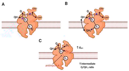 Antimycin A induces complex III-mediated superoxide production by binding to the Qi site to prohibit electron transfer between the heme BL and BH [], which favors superoxide production by increasing tERED. Inhibiting complex IV (e.g., with cyanide) can suppress complex III-mediated superoxide production by reducing cytochrome c to levels incompatible with catalysis (i.e., little to no oxidized cytochrome c available for reaction 7) [,,]. Under physiological conditions, ΔΨm can sufficiently slow electron transfer between bL and bH, to induce superoxide production at complex III [] (see Figure 3). Mathematical modelling reveals that complex III-mediated superoxide production is increased by a high ΔΨm (rising 4-fold as it increases from 150 to 200 mV), and is favored by a partially reduced Q pool []. Modelling also suggests that superoxide production is negligible at high ubiquinol levels, potentially due to restricting the availability of ubiquinone for a semi-reverse mechanism and BH binding (i.e., normal catalysis). The redox state of the Q pool and ΔΨm set physiological superoxide production at complex III [].
