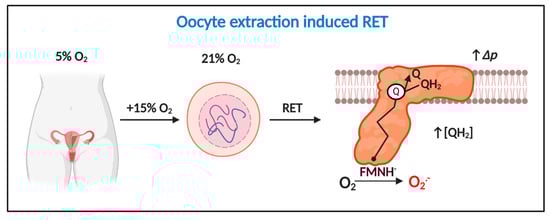 Oocyte extraction-induced RET is a potential temporally defined mechanism of mitochondrial superoxide production in assisted reproduction technologies (ART). Extracting oocytes induces a 15% increase in O2 exposure, which drives considerable RET-dependent O2●− production provided Δp is near maximal and QH2 is abundant. Extraction-induced light and damage could potentiate RET.