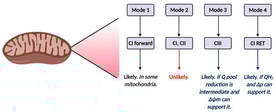 The exact sites that operate in each mode are dependent on contextual factors, including: substrate availability, enzyme content, and several regulatory factors. For example, high ATP, as well as reversible thiol oxidation, would constrain alpha keto glutarate dehydrogenase-mediated superoxide production in mode 2 to promote complex I-mediated superoxide production []. In mode 4, RET would be inhibited if complex I is locked in a structural inactive state termed the D-state [,,,,]. Different modes and sites (even within the same mode) can operate in parallel.