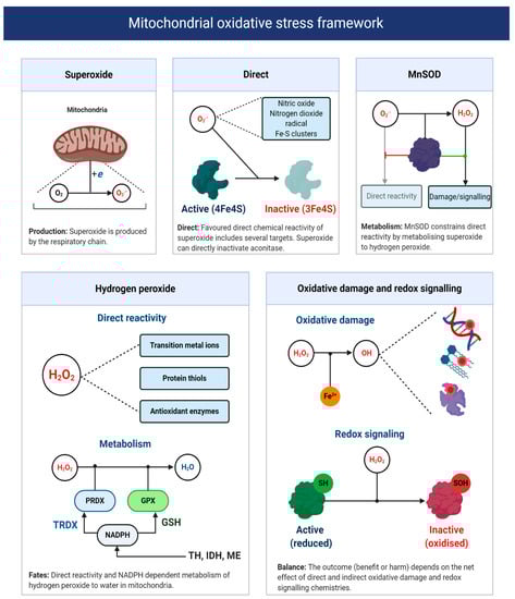 A mitochondrial oxidative stress framework. Upper panels depict the direct chemical reactivity of superoxide, which is regulated by MnSOD activity. The lower left panel depicts the direct chemical reactivity and metabolism of H2O2. The lower right panel illustrates two H2O2-focused chemical defined examples of oxidative damage and redox signaling. The net function of mitochondrial superoxide production will depend on whether direct and indirect reactivity (via H2O2 and other species like hydroxyl radical) is beneficial or harmful. Abbreviations: TH = transhydrogenase; IDH = NADPH-dependent isocitrate dehydrogenase; and ME = NADPH-dependent malic enzyme.