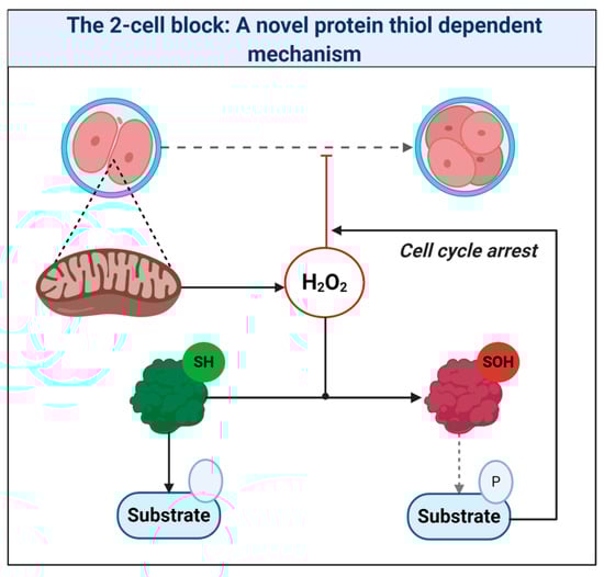 A pervasive increase in thiol oxidation is a novel cause of oxidative stress in ART. The mechanism reconciles the ability of the thiol oxidant diamide to disrupt OXPHOS in ART [], and reductants like 1-4-dithiothreitol to improve ART []. The novel framework presented should provide a useful paradigm to interpret mitochondrial oxidative stress in ART. Research is, however, required to unravel the chemical nature of the oxidative stress and its relationship to proximal mitochondrial superoxide production. It is vital to understand the physiological role of any intrinsic fertilization-induced increase in ROS production []. While fertilization is well known to increase H2O2 production in sea urchins [,,], Amaya’s group [] recently tied fertilization triggered Ca2+-induced mitochondrial ROS release to the regulation of the embryonic cell cycle via reversible cdc25c oxidation in Xenopus laevis. By tying mitochondrial ROS to the early cell cycle via thiol oxidation, their work provides a precedent to reimagine the 2-cell block as increased thiol oxidation of regulatory cell cycle proteins [] (see Figure 7). Consistent with this, reversing protein thiol oxidation may explain the ability of recombinant thioredoxin to release the 2-cell block [,,,]. To disambiguate the molecular details of ART-induced oxidative stress (e.g., source-target relationships), protein thiol oxidation of key regulatory proteins should be assessed [,]. Finally, intimate ties between mitochondria-regulated metabolites (e.g., succinate) and epigenetics raise the potential for far-reaching ART-induced oxidative stress, secondary to aberrant epigenetic wiring [,,], which could impact imprinting []. Precedent exists: stochastic development fluxes in the redox state of the glutathione pool regulate lifespan and stress resistance in C. elegans [,]. Moreover, the enzymes responsible were regulated by reversible thiol oxidation []. In mammals, embryonic exposure to rotenone, which modifies complex I-mediated superoxide production, can produce lasting DNA methylation changes in offspring []. Future studies may wish to interrogate the potential regulatory role of ROS-mediated retrograde mito-nuclear epigenetic signaling [].