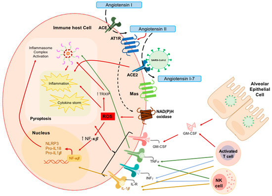 Molecular pathogenesis of SARS-CoV-2. SARS-CoV-2 virus can bind to specific receptors in host cells, such as alveolar epithelial cells or immune cells, by mediating an inflammatory cascade through inflammasome activation, usually through NLRP3, and by damaging, or even killing, host cells. Immune host cells, like macrophages and monocytes, are activated by the virus on a direct or indirect pathway, and contribute to the host response by causing inflammation and a cytokine storm. Other immune cells, such as NK cells and T-cells, can contribute to the immune response. On the other hand, Ang II is processed by ACE2 into Ang I-7. Ang II contributes to ROS production in an NAD(P)H-dependent mechanism thanks to the ACE2–Ang-(1–7)–Mas axis. AT1R mediates the production of ROS through a mechanism dependent on NADH and NADPH oxidases. ROS contributes to nuclear factor-kB (NF-κB) and TXNIP overexpression. NF-κB increases the expression of NLRP3, pro-IL-18, and pro-IL-1β whilst TXNIP modulates the structure of NLRP3, thereby allowing NLRP3 inflammasome assembly and facilitating pro-caspase-1 (pro-casp-1) autocleavage. Arrows denote activation. ACE2: angiotensin-converting enzyme 2; GM-CSF: Granulocyte-macrophage colony-stimulating factor; TNF: Tumor Necrosis Factor; INFγ: Interferon gamma; IL-R: Interleukin Receptor; AT1R: Angiotensin type 1; NADPH oxidase: nicotinamide adenine dinucleotide phosphate oxidase; ROS: reactive oxygen species. TXNIP: thioredoxin interacting/inhibiting protein. This figure is adapted from the work of Merad et al. [33].