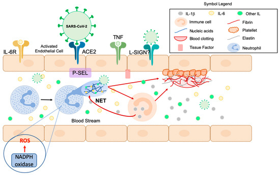 NETosis activated by SARS-CoV-2. SARS-CoV-2 and cytokines activate endothelial cells, which are able to produce adhesion molecules (e.g., P-SEL) and recruit neutrophils, which release NETs composed of nucleic acids, histones, and other proteins. NETs can bind to the SARS-CoV-2 present in the bloodstream and neutralize it. NETs can induce different immune cells to secrete IL-1β, which enhances NET formation in several diseases by providing positive feedback and accelerating thrombus formation. In addition, NADPH oxidase can produce ROS which activates NETosis. At the same time, the IL-6 receptor binds to IL-6, which enters the bloodstream and interacts with NETs. IL-1β is able to induce IL-6 expression which, in turn, is able to induce fibrinogen expression by increasing fibrin release. The virus’ endothelial damage can expose a tissue factor in activated endothelial cells capable of stimulating the coagulation pathway, which consists in fibrin deposition and blood clotting. At the same time, NETs also activate the coagulation contact pathway and bind activated platelets to contribute to amplify blood clotting. ACE2: angiotensin-converting enzyme 2; TNF: tumor necrosis factor; NET: neutrophil extracellular trap; IL-6R: Interleukin 6 receptor; P-SEL: P-Selectin. This figure is adapted from the work of Merad et al. [33].