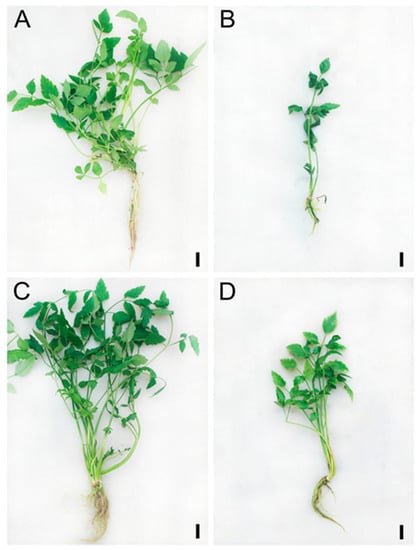 Effect of salt stress on phenotype of water dropwort (A) V11E0135 control (0 mmol/L NaCl), (B) V11E0135 treated (200 mmol/L NaCl), (C) V11E0022 control (0 mmol/L NaCl), and (D) V11E0022 treated (200 mmol/L NaCl). Bars = 1 cm.