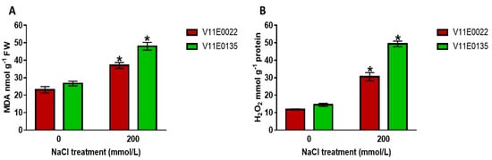 We found that salt stress significantly induced lipid peroxidation in terms of malondialdehyde (MDA) content in the leaves of both water dropwort cultivars (p < 0.05). Moreover, a high MDA content was present in V11E0135 compared to V11E0022 (Figure 3A). Similarly, H2O2 production rate was also significantly elevated in the leaves of both cultivars as compared to the control (p < 0.05). Moreover, significantly much higher H2O2 content was observed in V11E0135 compared to V11E0022 (p < 0.05) (Figure 3B).