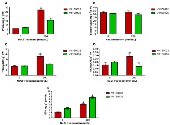 Compatible osmotyles such as proline, soluble sugars, and antioxidant molecules including polyphenols, flavonoids, and glutathione help in osmotic adjustment, and reduce the negative effects of salt stress by removing free radicals. Proline and total polyphenol concentrations were found to be higher in both cultivars under salt stress in comparison to the control (p < 0.05). However, V11E0022 showed a significantly higher level of proline, total polyphenolic compounds, and flavonoids compared to their counterpart (Figure 4A,C,D). Soluble sugars were also insignificantly increased in V11E0022 (Figure 4B). On the other hand, V11E0135 showed an insignificant decline in soluble sugars and an insignificant increment in the concentration of polyphenols under salt stress compared to the control (Figure 4B,C). Interestingly, GSH concentration was found higher in V11E0135 as compared to its other counterparts (Figure 4E).