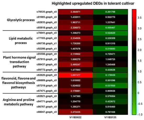 Total 14 DEGs of plant hormone signal transduction pathway were found comparatively overexpressed in V11E0022 compared to its counterpart (Figure 7; Figure S1 (Supplementary Materials)). Furthermore, in arginine and proline metabolic pathway, four upregulated DEGs were present in V11E0022 (Figure 7). Similarly, four DEGs involved in flavonoid, flavone and flavonol biosynthesis pathways were found to be upregulated in V11E0022 under salt stress (Figure 7).