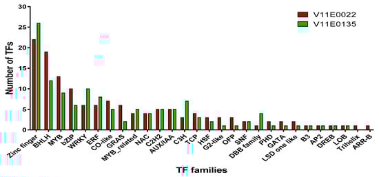 The current study showed that 138 differentially expressed TFs were identified in V11E0022 (56 genes upregulated and 82 downregulated) under salt stress. These were further classified into different 28 families, and the most enriched families were zinc finger-TFs that have 8 upregulated/14 downregulated DEGs, followed by bHLH have 8 upregulated/11 downregulated, MYB have 5/8, bZIP have 7/3, ERF have 2/4, and WRKY have 3/3 DEGs. Moreover, 124 differentially expressed TFs were found in V11E0135 (49 genes upregulated and 75 downregulated), and these were further classified into 26 families. Among these most enriched families were zinc finger-TFs, which have 16 upregulated/10 downregulated DEGs, followed by bHLH have 5 upregulated/7 downregulated, WRKY have 2/8, MYB have 3/6, bZIP have 3/3 DEGs, and ERF have 8 downregulated (Figure 8; Table S7 (Supplementary Materials)).