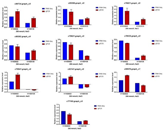 For validation of the RNA-Seq data, quantitative reverse transcription PCR (qRT-PCR) analysis was performed with 10 candidate DEGs. Salt treated and control samples from both cultivars were used for qRT-PCR. Results showed that the expression profiles of selected genes under qRT-PCR were in agreement with the results obtained from the RNA-Seq, which infers its reproducibility and accuracy (Figure 9).