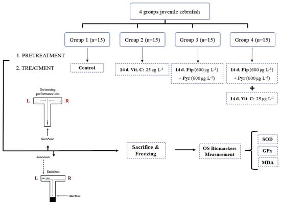 Before the experimental study was started, each group was evaluated in the swimming performance and social tests. These initial tests were conducted to demonstrate the normal behavior of each group before the treatment since previous studies shown that zebrafish had a high behavioral variability between each specimen which resulted in significant differences between the untreated groups [54,55,56]. This test was done after the accommodation period from 10 a.m. to 8 p.m. and repeated for 4 days. A number of 15 specimens were separated in four 10 L experimental aquariums with dechlorinated tap water. The grouping was as follows: Group 1 (the control group), Group 2 (25 µg L−1 vit. C), Group 3 (600 µg L−1 Fip + 600 µg L−1 Pyr), and Group 4 ([600 µg L−1 Fip + 600 µg L−1 Pyr] + 25 µg L−1 vit. C). Every day, the water from aquariums was replaced and the concentrations of the tested insecticides was maintained. Regarding the vit. C exposure, the fish were removed from the tanks and exposed to vitamin before being returned to the tank. The vit. C was administrated daily in the morning, in single used 150 mL PE (polyethylene) cups, for 30 min exposure in a solution (vit. C and dechlorinated tap water). This was done according to other studies that investigated the vit. C effects on zebrafish [57]. The exposure experiment was conducted for 14 days. The entire experimental design is presented in Figure 1 and was conducted in triplicates.