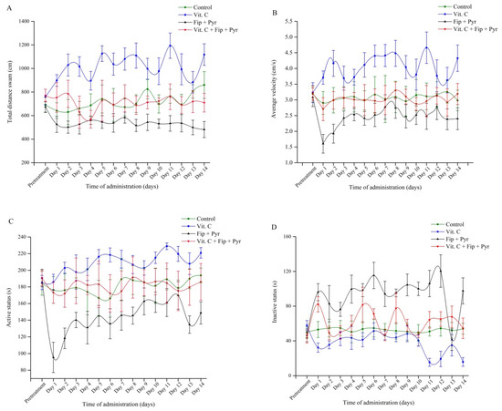 Zebrafish juvenile swimming performance test results during the experiment (n = 45 per group combined with triplicates experiments). (A) Total distance swam (cm). (B) Average velocity (cm/s). (C) Active status (s). (D) Inactive status (s). Green: control group, Blue: Vit. C group (14 d. 25 µg L−1), Black: insecticide mixture group (600 µg L−1 Fip + 600 µg L−1 Pyr), Red: insecticide mixture and vit. C group (14 d. [600 µg L−1 Fip + 600 µg L−1 Pyr] + 25 µg L−1 vit. C). The groups were compared to pretreatment days and the results were represented as average ± SD.