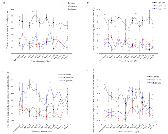 The behavioral trend for anxiety level was related to the swimming velocity and total distance traveled. The results showed no significant modifications observed in the control group (pretreatment: 184.3 ± 6.28 s vs. exposure period: 181. 1 ± 15.8 s, p > 0.05 ANOVA). Furthermore, the group that was exposed to 25 µg L−1 vit. C had the highest values for the moving time spent compared to pretreatment days (185.3 ± 8.46 s) in day 5 (216. 2 ± 8.63 s, p = 0.01), day 6 (218.4 ± 8.42 s, p < 0.05 Tukey), day 10 (215.4 ± 6.87 s, p < 0.05 Tukey), day 12 (219.7 ± 8.97 s, p < 0.05 Tukey), and day 14 (220.9 ± 6.32 s, p < 0.05 Tukey). Meanwhile, the insecticide mixture had the highest impact on the first day of administration (pretreatment: 190.7 ± 10.5 s vs. day 1: 95.3 ± 18.1 s, p < 0.01 Tukey). After day 1, the group started to move more by recording some high peaks in day 9 (162.5 ± 16.1 s), day 10 (161.2 ± 12.2 s), day 11 (161.2 ± 16.7 s), and day 12 (169.7 ± 16.5 s). In the last 2 days of the experiment (day 13: 134.7 ± 10.4 s, p < 0.01 Tukey and day 14: 148.7 ± 13.4 s, p < 0.05 Tukey), the group spent less time moving compared to pretreatment days (Figure 2C). However, treatment with vit. C influenced the moving time spent parameter of the group that received insecticide mixture. The results during the administration period (day 4: 187.3 ± 9.12 s, day 9: 191.3 ± 12.3 s, day 11: 186.4 ± 11.2 s, day 14: 186.1 ± 16.9 s) were closed to those from pretreatment (190.6 ± 6.74 s) (p > 0.05 Tukey).