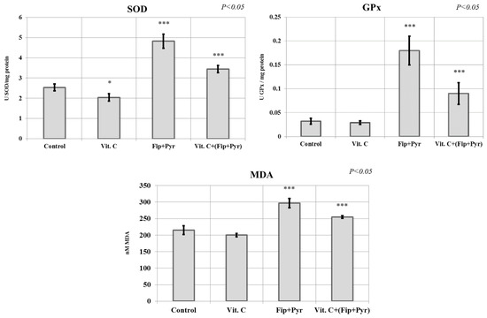 Superoxide Dismutase Determination Kit (SOD, 19160-1KT-F), Lipid Peroxidation (MDA) Assay Kit (MAK085-1KT), Glutathione Peroxidase Cellular Activity Assay Kit (GPx, CGP1-1KT), and Total Protein Kit, Micro Lowry, Peterson’s Modification (TP0300-1KT) were purchased from Merck, Germany. Physiological saline (0.90% NaCl) was purchased from Hemofarm (Romania). Ascorbic acid (Vit. C) was purchased from a local pharmacy in order to do a study in more related situations and conditions. The Vit. C was in a liquid form, soluble in water, and designated for children as a supplement. The composition of this supplement was acid ascorbic, glycerin, propylene glycol, and orange flavor. The supplement was diluted the desired concentration was obtained. For fipronil and pyriproxyfen (1:1), we used a common insecticide that is soluble in water and contains these two compounds with a quality certificate and it was purchased from a local store. Every 1.5 mL of this insecticide had the following composition: 67.5 mg of fipronil, 67.5 mg of pyriproxyfen, 0.3 mg of butylated hydroxyanisole, 0.15 mg of butylhydroxytoluene, and 60 mg of benzyl alcohol.