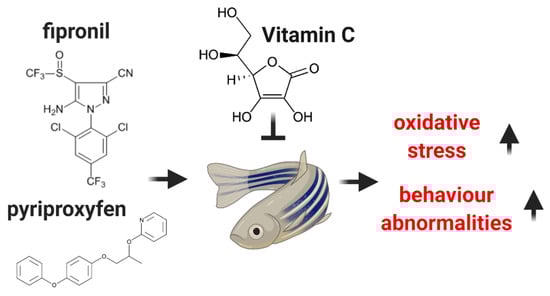 The social behavior test that was conducted in this study has been applied in the research of ASD. In zebrafish, a survival rate of zebrafish in the environment depends on social bound in shoal formation. In a normal condition, it is attracted by social stimuli that come from individuals of the same group. The tendency of an animal to interact and to approach a conspecific is well conserved in zebrafish [76], thus, the zebrafish avoidance behavior from social stimuli becomes a suitable model to study ASD when a new treatment for human patients is developed [77]. To assess the social preference behavior of zebrafish juveniles, we used individuals from its group as a stimulus. Simultaneous administration of 600 µg L−1 Fip and 600 µg L−1 Pyr during 14 days conducted to a reduction in social interaction in juvenile zebrafish. Consequently, this disruption in the sociability of juveniles was improved by vit. C exposure. Furthermore, this insecticide mixture might induce alterations in various brain regions causing cell malfunction and death. As we know, Fip metabolites can block GABA gated chloride channels in insects. In bees, Fip played a role in motor activity reduction and perturbations in bee behaviors such as seizures, tremors, agitation, and paralysis [78]. However, the specific mechanism of its action in fish and rodents is not fully understood. In a rodent study, it was shown that concomitant administration of 10 mg kg−1 Fip and 1 mg kg−1 picrotoxin, a GABA antagonist, have a synergistic effect on rodents’ memory formation and consolidation after 15 days [79]. Furthermore, some prior studies revealed the importance of excitatory glutamate and inhibitory GABA relation in brain development and functioning. Its imbalance is often linked with neurodevelopmental disorders such as attention deficit, hyperactivity disorder, epilepsy, and ASD [80,81]. Synthetized from glutamate, the GABA neurotransmitter is implicated in action potentials decrease by regulating the activity of the neurons [82,83,84]. Neuronal migration, synaptogenesis, differentiation, and growth of neuronal cells are controlled by glutamate, the primary excitatory neurotransmitter of CNS [84]. There are multiple studies that report elevated glutamate and low GABA levels in ASD individuals [82,85,86,87]. Thus, in the present study, changes in social behavior caused by the insecticide mixture were similar to those observed in an ASD model. Finally, our study demonstrated the influence of vit. C in ameliorating behavior alterations and oxidative stress products that were triggered by the mixture of two commonly used insecticides (Figure 5). Although, we showed here significant results for vit. C supplementation, there are also several limitations of our study as: the lack of measurements regarding quantification of vit. C in water and fish tissues. With other words, these effects of insecticides are significant and sometimes they alter the body systems in the long term. These events are connected and if just one is disrupted, this cycle is broken, e.g., intake of chemicals. Clearly, the complexity of ASD and the multitude of events that occur must be further studied through experimental research.