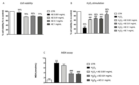 Antioxidant effect of AE extract in RAW 264.7 cultures stimulated with H2O2 and in MDA level. Cell viability test of AE extract (0.001 mg/mL, 0.01 mg/mL, 0.1 mg/mL, and 1 mg/mL) didn’t shown any significant cytotoxicity (A). Pre-treatment with AE extract at the concentration of 0.001 mg/mL, 0.01 mg/mL and 0.1 mg/mL and 1 mg/mL significantly prevented H2O2 cytotoxicity (B). MDA levels were significantly increased in the cell lysates following H2O2 stimulation. Lipid peroxidation was significantly attenuated by the pre-treatment with the extract at 0.01 and 0.1 mg/mL (C). Data are representative of at least three independent experiments; One-Way ANOVA test. *** p < 0.001 vs. Ctr; ### p < 0.001 vs. H2O2.