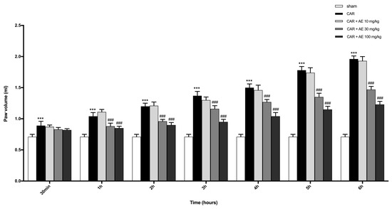 CAR injected at the subplantar level in the right paw caused a significant increase in the volume of the paw, starting from 2 h post CAR-injection until 6 h (Figure 4). Over the 6 h, a substantial decrease in the volume of the paw edema was detected in rats pre-treated with AE extract at 30 and 100 mg/kg compared to the sham group; while treatment with AE extract at 10 mg/kg did not significantly enhanced paw edema induced by CAR.