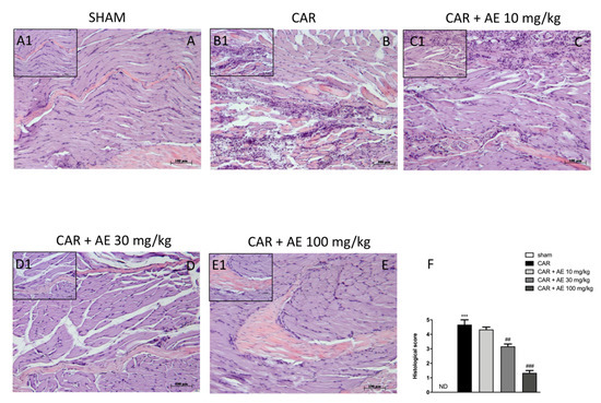 Effect of AE at different doses on paw edema volume following CAR-injection in rats. No histological variations were detected in group 1: Sham + vehicle rats (A) and (A1), see histological score (F). Extensive histological damage was evaluated in group 2: CAR + vehicle rats (B) and (B1), see histological score (F). Group 3: CAR + AE 10 mg/kg has been ineffective in reducing CAR tissue damage (C) and (C1), see histological score (F). CAR tissue damage was reduced by AE + 30 mg/kg (D) and (D1), see histological score (F) and AE + 100 mg/kg (E) and (E1), see histological score (F) treatments. Data are representative of at least three independent experiments; One-Way ANOVA test. *** p < 0.001 vs. sham; ## p < 0.01 vs. CAR; ### p < 0.001 vs. CAR. ND not detectable.