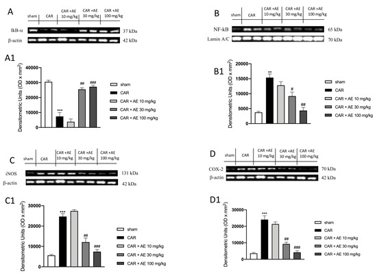 Effect of AE extract on NF-κB pathway and pro-inflammatory enzymes. IκB-α basal levels were identified in sham animals; while an increase in the degradation of IκB-α was found in CAR group. AE 10 mg/kg didn’t increase IκB-α levels; AE 30 mg/kg and 100 mg/kg restored IκB-α expression (A) and densitometric analysis (A1). NF-κB expression was significantly increased in the CAR group compared to the sham group; such expression was decreased by AE 30 mg/kg and 100 mg/kg treatments but not from 10 mg/kg (B) and densitometric analysis (B1). Analysis of iNOS (C) and densitometric analysis (C1) and COX-2 (D) and densitometric analysis (D1) showed basal level in the sham group that was significantly increased in the CAR group. AE 10 mg/kg did not reduce COX-2 and iNOS expressions; contrarily AE extract at two highest doses, significantly reduced these expressions. Data are representative of at least three independent experiments; One-Way ANOVA test. ** p < 0.01 vs. sham; *** p < 0.001 vs. sham; # p < 0.05 vs. CAR; ## p < 0.01 vs. CAR; ### p < 0.001 vs. CAR.