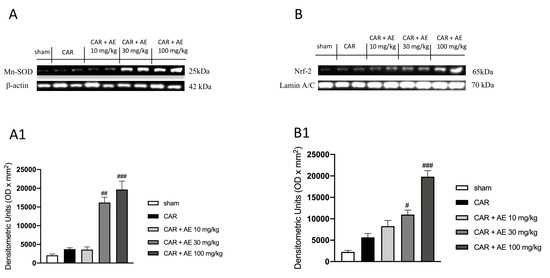 Effect of AE extract on antioxidant response in rat paw issue. Basal levels of MnSOD and Nrf2 were found in sham and CAR groups. AE extract, in a dose dependent manner, promoted the antioxidant response, increasing MnSOD expression (A) and densitometric analysis (A1) and Nrf2 (B) and densitometric analysis (B1). Data are representative of at least three independent experiments; One-Way ANOVA test. # p < 0.05 vs. CAR; ## p < 0.01 vs. CAR; ### p < 0.001 vs. CAR.