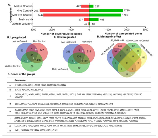 Distribution of differentially expressed genes in yeast cells grown with and without melatonin (5 μM or 25 μM), in stressed (2 mM of H2O2) and in unstressed conditions (Control, Mel, MelH, 25MelH and H). (A) The number of differentially expressed genes between different conditions (fold change −1 ≤ FC ≥ 1; p-value < 0.05). (B,C) Venn diagram showing the number of common genes found among the Mel vs. Control, MelH vs. Control and H vs. Control comparisons (up- (B) and down (C) regulated genes). (D) Venn diagram showing the number of common genes found among the up- and downregulated genes identified in the Mel vs. Control and MelH vs. H comparisons. (E) List of genes in some groups indicated in (B–D). The list of genes and the GO enrichment analysis of all the groups is shown in Table S1.