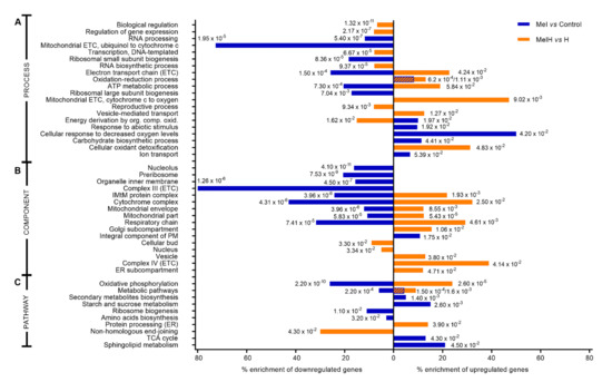 Categories enriched by differentially expressed genes that were up- (values to the left) and down- (values to the right) regulated (1 ≤ fold change ≥1; p-value < 0.05) among nonstressed (blue) and stressed (orange) (2 mM H2O2) cells in the absence or presence of melatonin (5 μM). Percentages of enrichment are calculated as the ratio of the number of up- or downregulated genes in relation to the total number of genes involved in each molecular function or pathway in S. cerevisiae. The numbers correspond to the p-values. When two p-values are presented, the left one corresponds to Mel vs. Control and the right to MelH vs. H. (A) Biological process function enrichment from Gene Ontology (GO) analysis, (B) cellular components enriched according to GO analysis, (C) pathway enrichment analyzed with the DAVID tool. Abbreviations: ETC, electron transport chain; ER, endoplasmic reticulum; TCA, citrate cycle, IMtM, inner mitochondrial membrane.