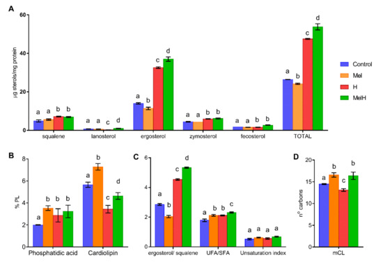 Lipid composition of nonstressed and stressed yeast cells with 2 mM of H2O2, grown with and without 5 μM of melatonin (Control, Mel, H, MelH). (A) Sterols. (B) Phospholipids. (C) UFA/SFA ratio (from Vázquez et al. [15]) and unsaturation index defined as follows: [(% C16:1 + % C18:1) + 2 (% C18:2) + 3 (% C18:3)]/100. (D) Medium-chain-length of FA (mCL, from Vázquez et al. [15]). Letters indicate significant differences between lipid concentrations (p-value < 0.05).