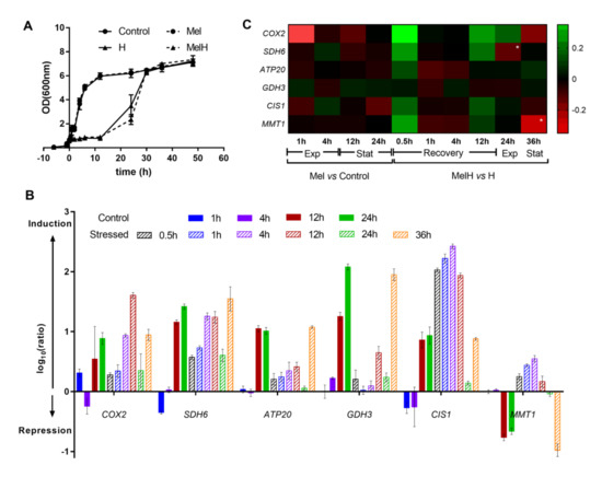 Gene expression was analyzed at the same sampling points used in the microarray assays and at different growth times under the four conditions (Control, Mel, H, MelH), and the results are shown in Figure 5. Most of the selected genes were upregulated either by entry into the stationary phase or by the response to oxidative stress exposure (which inhibited cell growth for 12 h, Figure 5A), following a general environmental stress response profile [60]. In nonstressed cells (Control condition), almost no changes in the expression of these genes were observed during the exponential phase (1 and 4 h) (Figure 5A,B), and only some of the genes were slightly downregulated (SDH6, CIS1) or upregulated (GDH3). However, the expression of all the genes (except MMT1) increased significantly in the stationary phase (12 and 24 h) (Figure 5A,B). Exposure to oxidative stress upregulated the expression of all genes, and these changes were significant for some of them at 1 h and for all the rest, except for GDH3, at 4 h (Table S3); their expression then decreased during the exponential phase (24 h), reaching the same levels observed before the stress in some cases, and significantly increased at the stationary phase (36 h) (Figure 5B). An exception was observed for MMT1, whose expression decreased in the stationary phase, as observed in the control condition.