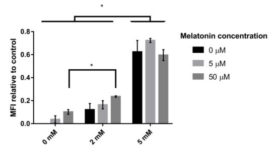 Effect of H2O2 and melatonin on the number of mitochondria per cell. The values are expressed as the mean fluorescence intensity (MFI) of the different conditions compared to the control. The cells were incubated with different melatonin concentrations (0 µM, 5 µM and 50 µM) and then subjected to treatment with different H2O2 concentrations (0 mM, 2 mM and 5 mM). Error bars represent the standard deviation, and * indicates statistically significant differences between media (p < 0.05).