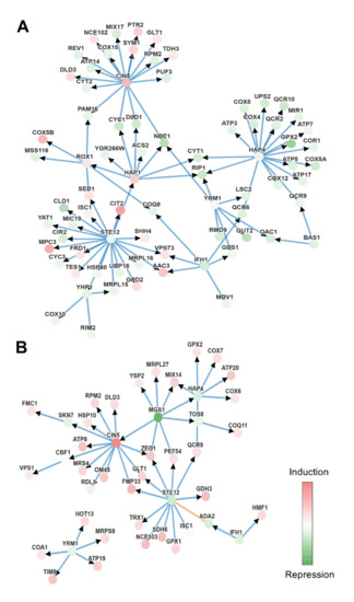 When we focused only on mitochondrial genes, the same transcription factors were identified together with some additional transcription factors, such as Hap4p and Yrm1p in both stressed and nonstressed cells and Hap1p and Rox1p only in the Mel vs. Control comparison (Figure 7). Hap1p, Hap4p and Rox1p are heme-dependent transcriptional regulators. In the presence of heme, the Hap2/3/4/5 complex (in which Hap4p provides the activation domain) and Hap1p activate and upregulate genes required for aerobic growth, and Hap1p is also responsible for activating Rox1p, a repressor of hypoxic-related genes.