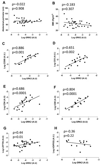 Correlation between abdominal perimeter (A), body mass index (BMI) (B), the macrophage marker CD68 (C), the T lymphocyte markers CD3 (D), CD4 (E), and CD8 (F), leptin (G), and adiponectin (H) and G protein-coupled receptor kinase 2 (GRK2) mRNA in human aortic perivascular adipose tissue. Univariate association was performed by Spearman correlation test. AU: arbitrary units.