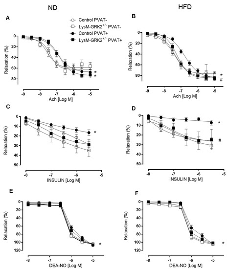 Concentration-response curves to acetylcholine (ACh (A,B)), insulin (C,D) and diethylamine NONOate (DEA-NO (E,F)) in aorta segments with perivascular adipose tissue (PVAT+) or without (PVAT-) from control and LysM-GRK2+/− mice fed on normal diet (ND) or high (HFD) fat diet (n = 7–19); * p < 0.05 vs. PVAT−, # vs. control mice, by two-way ANOVA.