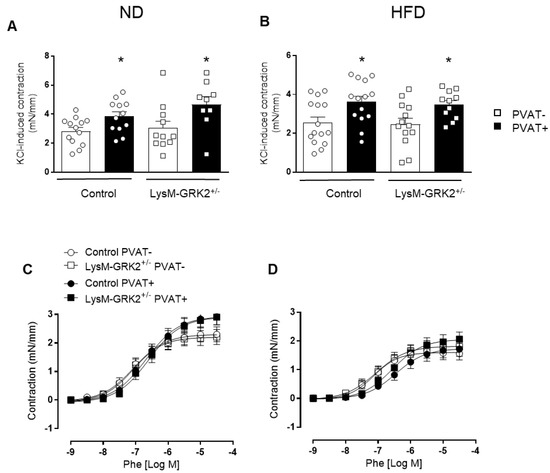 Maximum response induced by 120 mmol/L K+ solution (A,B) and concentration-response curves to phenylephrine (Phe; (C,D)), in aorta segments with perivascular adipose tissue (PVAT+) or without (PVAT−) from control and LysM-GRK2+/− mice fed on normal (ND) or high (HFD) fat diet (n = 9–17); * p < 0.05 vs. PVAT− by unpaired t-test (A,B).