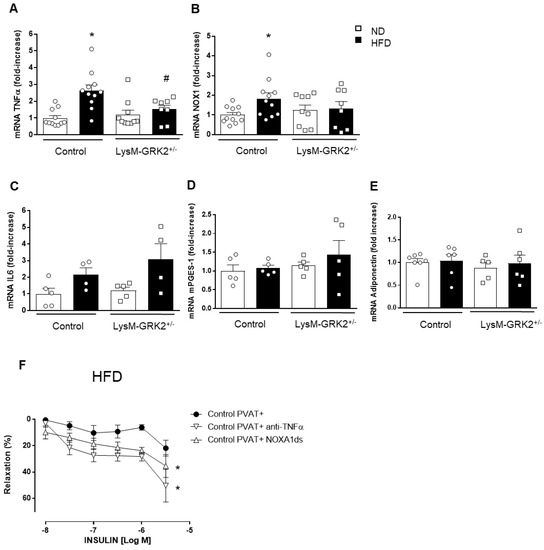 mRNA expression of tumor necrosis factor-α (TNFα) (A), the NADPH oxidase (Nox) subunit Nox1 (B), IL6 (C), microsomal prostaglandin E synthase (mPGES-1 (D) and adiponectin (E) in aortic perivascular adipose tissue from control and LysM-GRK2+/− mice fed on normal (ND) or high (HFD) fat diet. * p < 0.05 vs. ND, # vs. control mice by Mann–Whitney or unpaired t-test when normality is reached (by Shapiro–Wilk). (F) Concentration-response curves to insulin in aorta segments with perivascular adipose tissue (PVAT+) in the absence or in the presence of an anti-TNFα antibody or the specific Nox1 inhibitor NOXA1ds from control mice fed on high fat diet (HFD) (n = 4–5); * p < 0.05 vs. arteries in the absence of inhibitors by two-way ANOVA.