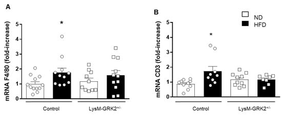 mRNA expression of F4/80 (A) and CD3 (B) in aortic PVAT from control and LysM-GRK2+/− mice fed a normal (ND) or a high fat diet (HFD). * p < 0.05 vs. ND by Mann–Whitney or unpaired t-test when normality is reached (by Shapiro–Wilk).