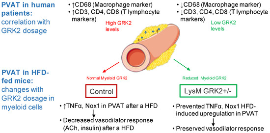 In this work, we uncovered that, in aortic PVAT from patients with extensive vascular damage, there is a positive and highly significant correlation between GRK2 expression and macrophage and lymphocyte markers. Moreover, we show here that a partial deficiency in GRK2 solely in myeloid cells can prevent the impairment of endothelium-dependent vasodilator responses induced by PVAT in a model of HFD, in the absence of significant effects on vasoconstriction. This effect appears to involve a decreased capacity for the HFD to infiltrate macrophages and T lymphocytes and to upregulate Nox1 and TNFα in PVAT from LysM-GRK2+/− mice.