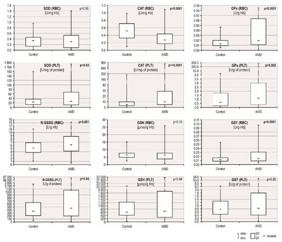 Excess oxidative stress coupled with overwhelmed antioxidant defence systems are thought to be the important contributors to the complex pathophysiology of AMD. We chose 6 factors to analyse the efficiency of the antioxidant system in patients with AMD and controls: the activities of five enzymes (SOD, CAT, GPx, R-GSSG and GSH transferase) and concentrations of reduced glutathione (GSH) in red blood cells (RBCs) and platelets (PLT). The AMD group presented higher values for 7 of the 12 tested factors compared with the control group (Table 4, Figure 1): GPx, R-GSSG, GSH transferase in RBCs and SOD, catalase, GPx and R-GSSG in PLT. A significant downregulation in catalase activity levels was observed in RBCs from patients with AMD (0.33 ± 0.21 U/mg Hb) compared to controls (0.53 ± 0.24; p < 0.0001). A multivariate analysis of patients and controls adjusted for age, sex, and smoking status (pack-years) revealed that AMD was an independent variable associated with a lower RBC catalase (β = −0.37, p < 0.001) and higher PLT catalase (β = +0.25, p < 0.001), RBC GPx (β = +0.26, p < 0.001), PLT GPx (β = +0.16, p = 0.001), RBC R-GSSG (β = +0.13, p = 0.009), PLT R-GSSG (β = +0.12, p = 0.02) and RBC GSH transferase (β = +0.23, p < 0.001) activity levels.
