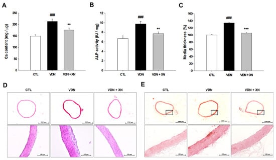 3.2. Effects of XN on the Attenuation of Vascular Calcification Markers in VDN-Induced VC