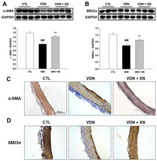 3.4. Effects of XN on the Expressions of α-SMA and SM22α in VDN-Induced VC