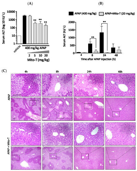 3.1. Protective Effect of Mito-T against APAP-Induced Liver Injury in C57BL/6J Mice