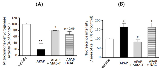 - Donnelly, P.J.; Walker, R.M.; Racz, W.J. Inhibition of mitochondrial respiration in vivo is an early event in acetaminophen-induced hepatotoxicity. Arch. Toxicol. 1994, 68, 110. [Google Scholar] [CrossRef] [PubMed]