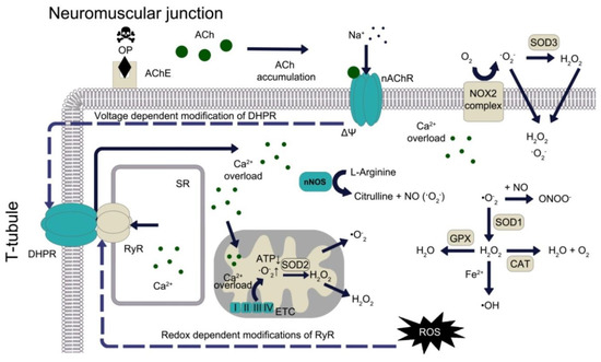 Role of reactive oxygen species (ROS) in the mechanism of toxic effects of organophosphates on skeletal muscle. OP—organophosphate; ACh—acetylcholine; AChE—acetylcholinesterase; nAChR—nicotinic acetylcholine receptor; nNOS—neuronal nitric oxide synthases; ATP—adenosine triphosphate; SOD—superoxide dismutase; ETC—electron transport chain in mitochondria; DHPR—Dihydropyridine receptor; RyR—Ryanodine receptor; SR—Sarcoplasmic reticulum; NOX—NADPH oxidase; GPx—Glutathione peroxidase; CAT—Catalase.