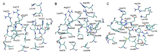 Figure 3, Figure 4 and Figure 5 show the three-dimensional structures of Sudlow site I; Sudlow site II; and the redox site (Cys34) of HSA, BSA and RSA. Due to the deletion at position 116, the numbering of amino acids in BSA after residue 115 is shifted by one position relative to the numbering of HSA and RSA. Below, when discussing the structure of albumins of different species, we give the numbering of HSA as the reference, and if necessary, the corresponding amino acids of BSA is given in brackets—for example, Tyr150(Tyr149). As can be seen in Figure 3 and Figure 4, Sudlow site I is much less conservative than Sudlow site II. Thus, Lys195 and Lys199 of HSA are replaced with more branched-chain arginines Arg194 and Arg198 in BSA. In RSA, Lys195 is also replaced with arginine. Arg222 in HSA and in RSA is substituted by Lys221 in BSA. Leu219 and Leu218 in HSA and BSA are replaced with Met219 in RSA. Similarly, the isoleucines Ile264 and Ile263 in HSA and BSA correspond to Met264 in RSA. Isoleucines are located in the position 290(289) in HSA and BSA, while leucine—in RSA. Valines at position 293(292) in HSA and BSA are replaced with isoleucine in RSA. Histidines His242(His241) and His288(His287) in the primary sequence of HSA and BSA are substituted by Asn242 and Gln288 in the RSA sequence. The latter substitutions are of particular interest since His242(His241) and His288(His287) are located in very close proximity to the catalytic tyrosine Tyr150(Tyr149). According to our computational experiments [70,71,72,73], the imidazole ring of His242(241) can attract the proton of the hydroxyl group of Tyr150(Tyr149) and thus regulate the hydrolytic activity of the tyrosine. It should be expected that interspecies differences in the binding and catalytic properties of albumin will show themselves in the characteristics of Sudlow site I.