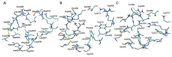 Sudlow site II is highly conservative (Figure 4): there are substitutions only in positions 388 (Ile388, Ile387 and Val388 in HSA, BSA and RSA, respectively), 390 (Gln390, Gln389 and Thr390 in HSA, BSA and RSA, respectively), 407 (Leu407, Leu406 and Ile407 in HSA, BSA and RSA, respectively) and 449 (Ala449, Thr448 and Val449 in HSA, BSA and RSA, respectively). All the replacements, except for the homologous substitution at position 407, are located at a sufficient distance from the catalytic tyrosine Tyr411(Tyr410).