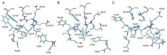 The structures of the redox site (Cys34) of human (A), bovine (B) and rat (C) albumin.