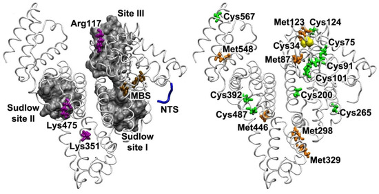 The main binding sites of HSA and the amino acids that are responsible for the participation of albumin in redox reactions. Left: dark gray surface shows the areas of major albumin binding sites—Sudlow site I, Sudlow site II and Site III (see Section 2); the N-terminal site (NTS, Asp-Ala-His-Lys) is shown in blue; the metal-binding site (MBS, His-67 and His-247) is shown in brown; the amino acids involved in the binding of polyunsaturated fatty acids are shown in purple. Right: Cys34 is represented in yellow; six methionine residues are shown in orange; the cysteines within the disulfide bonds that can be reduced when interacting with low-molecular-weight thiols are shown in green. To create the figure, a three-dimensional structure of HSA from the PDB database, code 3JQZ [57], was used.