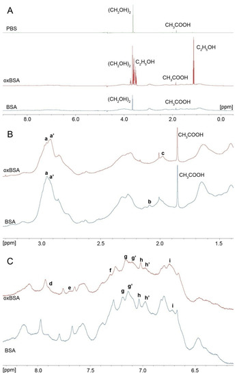 In our own studies, we have applied the 1H NMR method to study how the oxidation of BSA with ethacrynic acid (EtAc) affects the conformational characteristics of the protein. Figure 7 shows the spectra of three samples: phosphate buffered saline (PBS) used to prepare BSA solution; commercial BSA of concentration 360 μM; commercial BSA of concentration 360 μM after incubation with EtAc in a molar ratio of 1:5 (oxBSA). Commercial BSA was prepared using the same procedure as in [123]. Oxidised BSA was prepared as described in [110] with minor modifications. The prepared samples of commercial and oxidised BSA were supplemented with deuterium oxide and scanned at room temperature by the one-dimensional 1H-NMR water suppression method using excitation sculpting with gradients on a Bruker Avance III 500 NMR spectrometer. Chemical shifts δ were calibrated to tetramethylsilane; the spectra were accumulated for 128 scans using a 4.3 s delay between the first radiofrequency pulses.