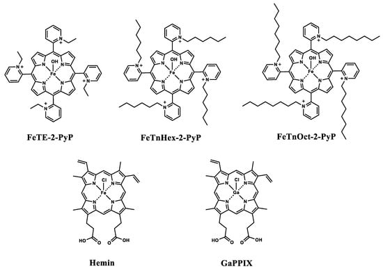 The metalloporphyrins used in this study (Figure 1) include Fe(III) N-alkylpyridylporphyrins, whose synthesis and characterization has been described in detail elsewhere [24]. These FePs were specially designed by maintaining the tetrapyrrole core, while modifying the periphery by attaching aliphatic chains of varying length. Consequently, compounds with desired lipophilicity and three-dimensional structure were obtained. The length of the aliphatic chains attached to the pyridyl nitrogen at the meso position varied from ethyl FeTE-2-PyP, Fe(III) meso-tetrakis(N-ethylpyridinium-2-yl)porphyrin), to hexyl FeTnHex-2-PyP, Fe(III) meso-tetrakis(N-hexylpyridinium-2-yl)porphyrin) to octyl FeTnOct-2-PyP, Fe(III) meso-tetrakis(N-octylpyridinium-2-yl)porphyrin). All tested FePs are water-soluble. The charges are omitted throughout the manuscript for clarity. Commercially available gallium protoporphyrin IX (GaPPIX) and hemin were used without further purification. Although isolated as pentachloride salts in solid state, in aqueous systems at physiological pH, cationic FePs coordinate axially with one hydroxo and one water ligands [24], as indicated in Figure 1; for simplicity, axial coordination is omitted throughout the text and in other figures.