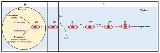 Proposed intracellular (A) and extracellular (B) conversions of FeTnHex-2-PyP. In cells, FePs can undergo two major pathways. We hypothesized that the 1st pathway results in the bactericidal effect of FeP. FePs have strong preference for axial bonding, particularly nitrogen-containing ligands such as amino groups of proteins, and the bases of DNA and RNA. Such binding may interfere with cellular metabolism and induce bactericidal effect. The 2nd pathway describes the degradation of FePs in the presence of cellular reductants (such as ascorbate, glutathione, cysteine etc.). When ascorbate (Asc−) acts as an one-electron reductant, its oxidation results in formation of ascorbyl radical (Asc●), while FeIIIP is reduced to FeIIP. In a next step, FeIIP binds oxygen and gives rise to FeIIIP(O2●−) due to intramolecular electron transfer. This species gets reduced with one electron in the presence of proton, H+, to iron hydroperoxo species, FeIIIP-O-O-H, which in turn undergoes O–O homolysis, leading to the solvent caged intermediate [H3O+, O=FeIVP, ●OH]. This step is followed by one electron oxidation of O=FeIVP by hydroxyl radical, ●OH, to yield the species in which Fe oxidizes its own ligand, Fe(IV) porphyrin π cation radical, [O=FeIVP●+] [46]. Subsequently, this species falls apart into free Fe3+ and oxidized/degraded ligand. The degradation of O=FeIVP●+ would compete with the substrate oxidation by this species in cellular environment [24,25,45]. The pathway is consistent with our data, as no intracellular FeP could be detected in the uptake experiments when FeP was incubated together with ascorbate (Figure 6).