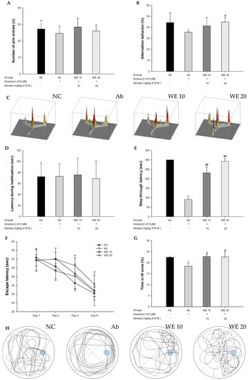 To confirm spatial learning and memory function, the Y-maze test was conducted (Figure 3A–C). The Ab group showed a significant decrease in spontaneous alternation behavior (35.58%) compared to the NC group (44.36%) (Figure 3B). However, the behavior of the WE groups (41.27% and 44.85%; WE 10 and WE 20, respectively) improved. In particular, the WE 20 group was significantly restored compare to the Ab group. The number of arm entries of all the groups was not statistically different (Figure 3A). In the results of path tracing, the Ab group showed irregular movements, but the WE groups were similar to the NC group (Figure 3C).